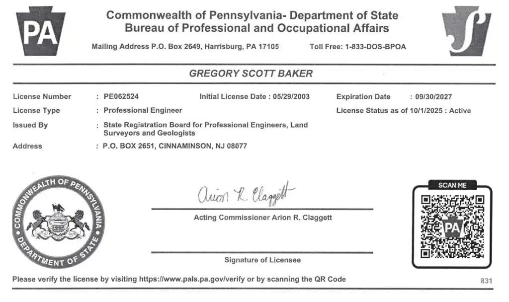 We are a professional licensed structural engineer headquartered in Burlington County New Jersey, Penn Valley Engineering maintains the following valid State Certificates of Authorization: